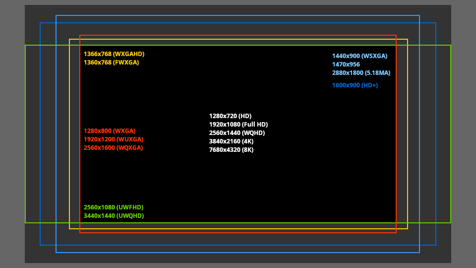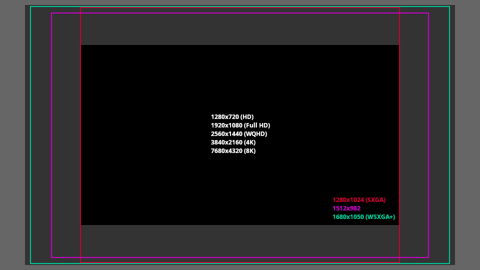 For very detailed borders it could look a bit odd if some specific detail like a face or switch gets clipped by the screen edges. So it might be helpful to know where the clipping lines will be when placing such elements on the border. You can download the .xcf file for GIMP to use as a template when arranging the layout for such borders. The resolution shown in green, yellow, and light blue are not exactly the same aspect ratio, but the differences are mostly just a few pixels that would be very difficult to notice if they get clipped by the screen edges.
